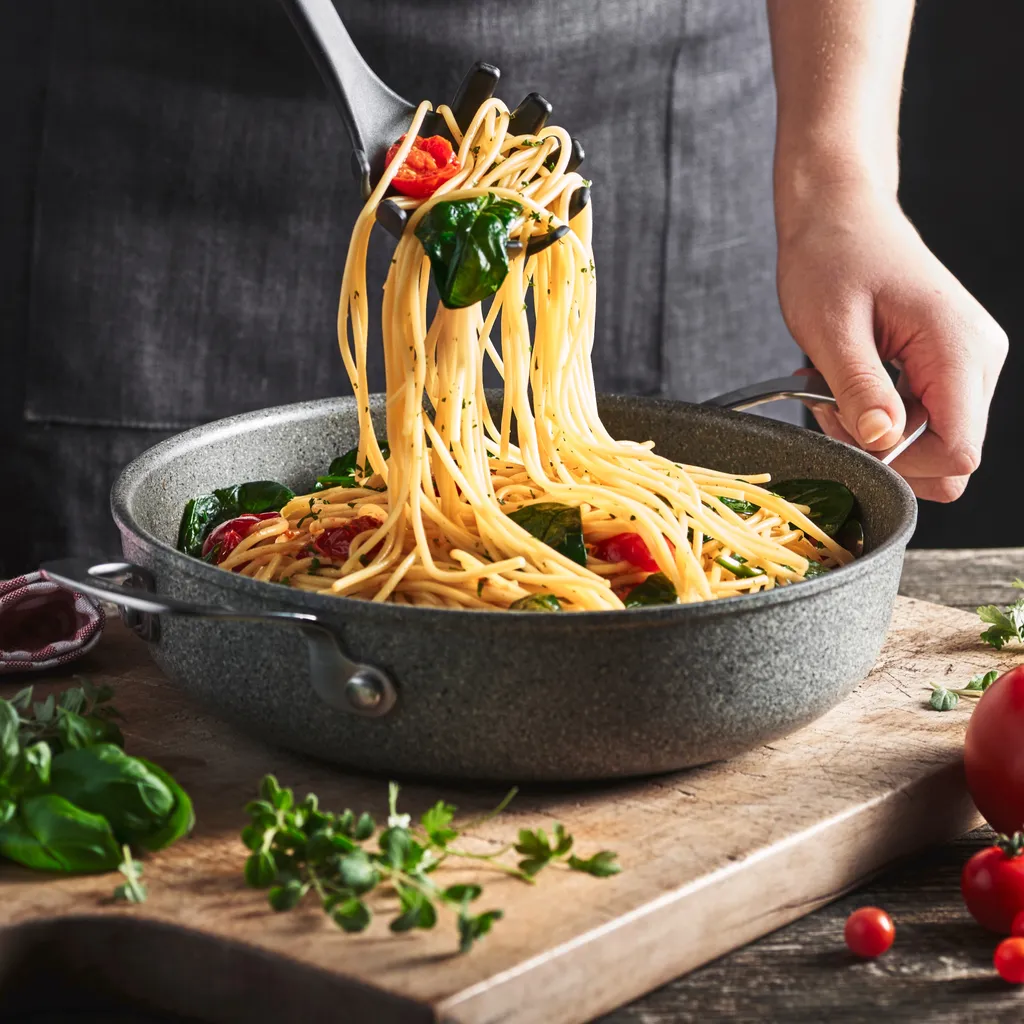 Mit der Servierpfanne mit Glasdeckel der Serie Salina von BALLARINI mit 28 cm Durchmesser schaffst du Momente des Glücks: Die ganze Familie sitzt am Tisch, in der Mitte eine große Portion Pasta Bolognese – und alle bedienen sich nach Lust und Laune. So schön und lebendig kann Kochen sein! Mit ihrem Granit-Look macht sich die Servierpfanne optisch besonders gut auf deiner Tafel. Maße: Ø 28 x 7,7 cm