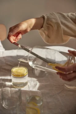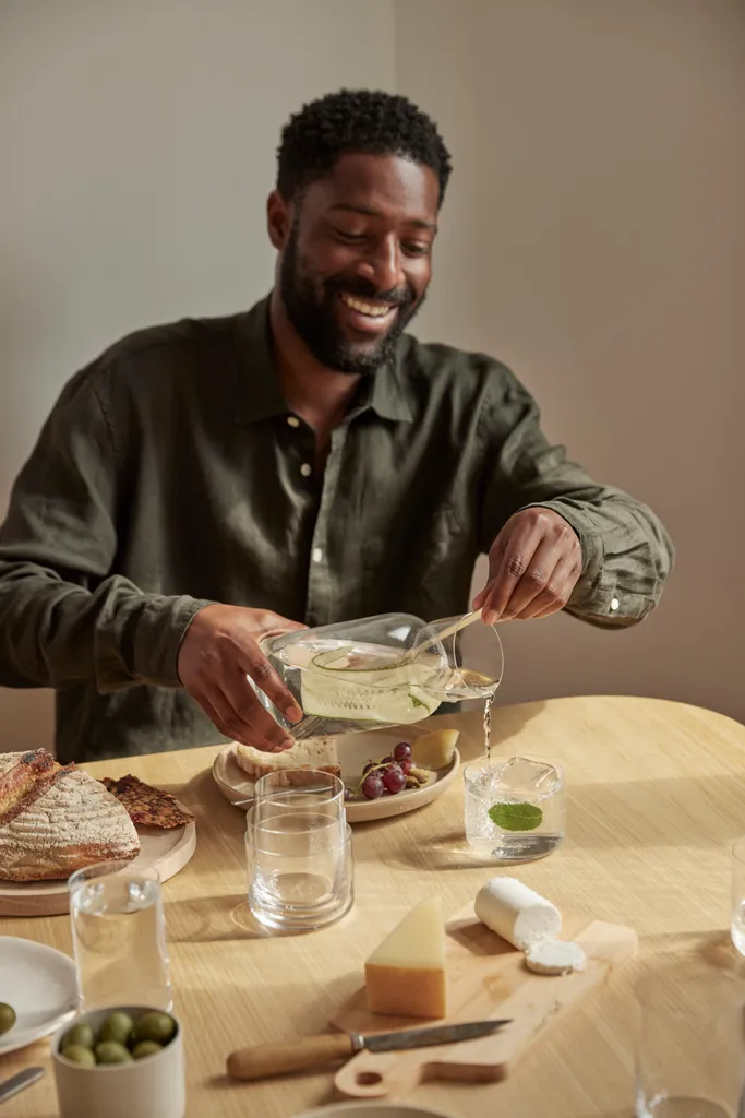 Das Volumen der Nesting Carafe ist individuell an Aarkes Sprudelwasser angepasst – plus Eiswürfel, Garnierung und einen Schuss unserer Aarke Drink Mixers.