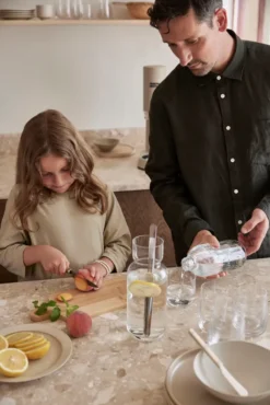 Die Nesting Carafe ist aus hochwertigem Kristallglas mit 1,5 mm dünnen Seiten gefertigt. Der Mixing Spoon besteht aus 100% lebensmittelechtem Edelstahl.