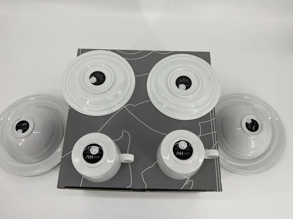 Lieferumfang: 2 x Kaffeetassen, 2 x Untertassen, 2 x Müslischalen, Durchmesser 14 cm und 2 x Dessertteller, flach, Durchmesser 21 cm.