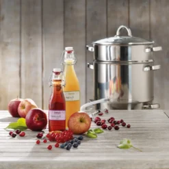 - Nützlicher Entsafter zur Gewinnung von naturreinem Fruchtsaft, bestehend aus Wassertopf, Safttopf, Fruchtkorb und Deckel – arbeitet nach ergiebigem Prinzip der Dampfentsaftung