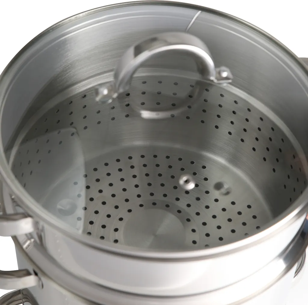 Ideal für fruchtige und schonend zubereitete Säfte aus Obst und Gemüse: Mit dem praktischen Entsafter lässt sich in wenigen Schritten naturreiner Fruchtsaft gewinnen. Vorteilhaft ist besonders, dass der Fruchtzucker im Obst weitestgehend erhalten bleibt und wenig Süße zusätzlich zugefügt werden muss. Bei dem ergiebigen Prinzip der Dampfentsaftung wird mit mehreren, übereinander gestapelten Gefäßen gearbeitet. Der untere Wassertopf mit nützlicher Literskala kann bis zu 3 Liter Wasser aufnehmen und kommt auf der Herdplatte zum Stehen – Pluspunkt: Er eignet sich für alle Herdarten. Darüber befindet sich der Safttopf mit ca. 30 cm langem Silikonschlauch inklusive Verschlussklemme – so kann der Saft direkt abgefüllt werden und ein unbeabsichtigtes Ablaufen des Inhalts wird vermieden. Obenauf steht der siebartige Fruchtkorb mit stoßfestem Deckel für die Obst- und Gemüsestücke plus benötigter Zuckermenge. Auch für Beeren & Co. eignet sich die Kombi bestens. Wer die Fruchtrückstände nach dem Vorgang weiterverwenden möchte, kann diese hervorragend als Mus nutzen. Das ist nicht nur lecker, sondern auch effizient, denn auf diese Weise werden die Lebensmittel restlos verwertet. Das Set besteht komplett aus Edelstahl und ist mit einem Glasdeckel ausgestattet. Insgesamt beträgt das Fassungsvermögen ca. 8 Liter bei einem Durchmesser von ca. 25 cm. Eine zweckmäßige Errungenschaft für jeden Einmachfan.