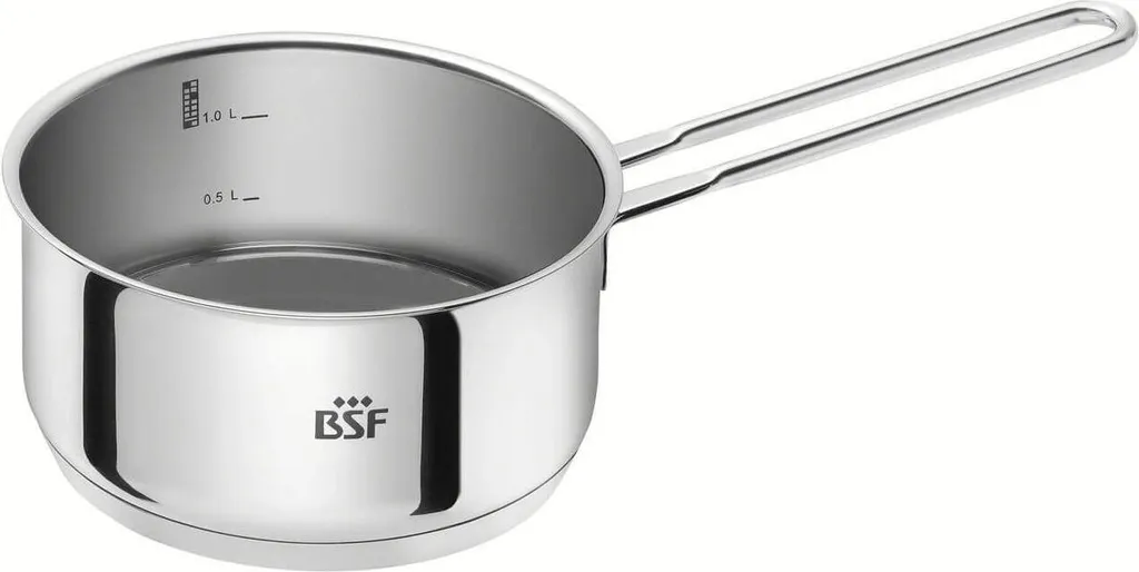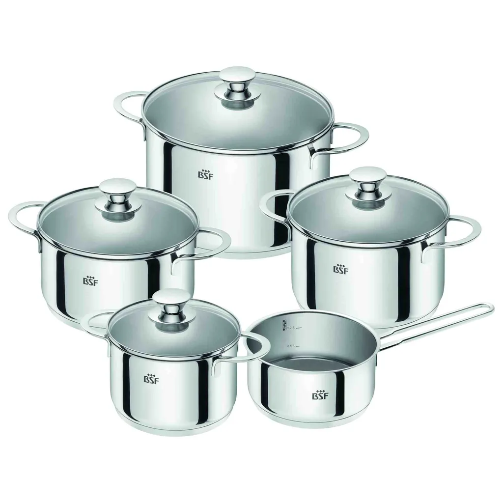Das 5-teilige Kochtopfset aus der Serie BSF Bordeaux besteht aus drei Kochtöpfen mit einem Fassungsvermögen von 2, 3,5 und 6 Liter, einem 1,5 Liter Stieltopf und einem 3 Liter Bratentopf. Die Töpfe besitzen einen Sandwichboden mit einem massiven Kern aus Aluminium, der die Hitze optimal verteilt. Das Topfset Bordeaux ist aus hochwertigem, hygienischem, robustem, langlebigem und pflegeleichten Edelstahl 18/10 gefertigt, kann auf jeder Kochplatte verwendet werden einschließlich Induktion. Das Topfset ist Spülmaschinengeeignet. So sieht das BSF Topfset BORDEAUX nicht nur Klasse aus, die Sichtkochdeckel mit Edelstahleinfassung ermöglichen wasserarmes und energiesparendes Kochen. Der ausgestellte Schüttrand sorgt für problemloses Ausgiessen ohne Kleckern. Die ergonomisch geformten Griffe bestehen aus poliertem Edelstahl. Die integrierte Füllskala hilft beim Dosieren. Ob Gelegenheits- oder passionierter Hobbykoch – mit dem BSF Topfset Bordeaux geht kochen wunderbar leicht von der Hand.