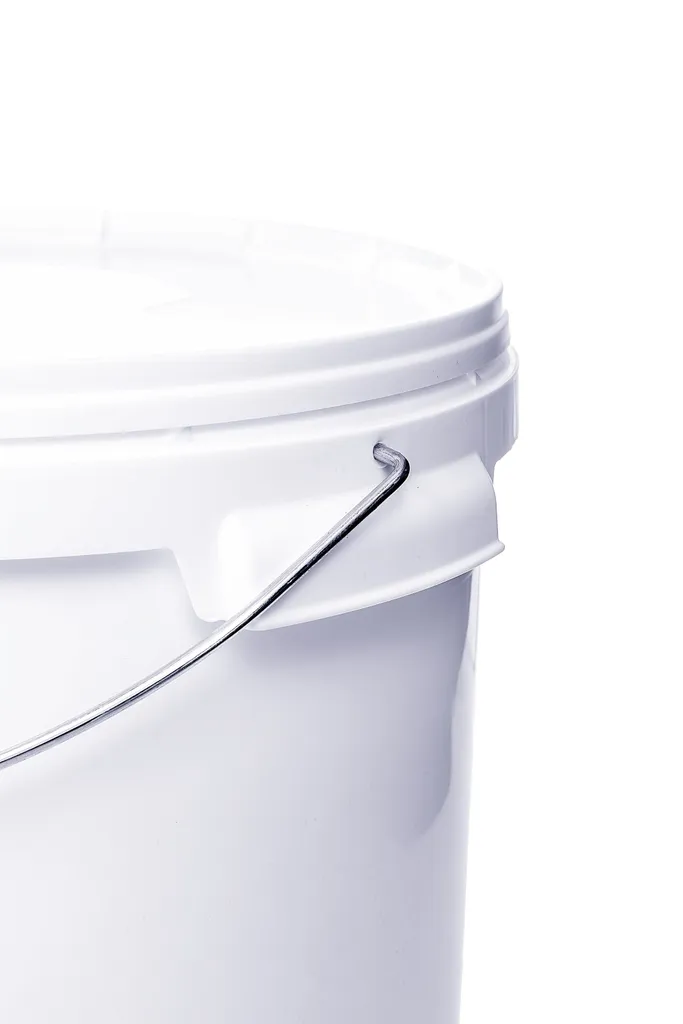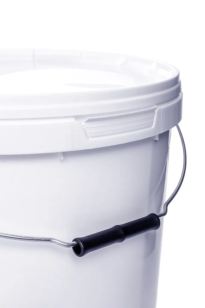 Der Eimer ist mit einem Verschluss und zwei Kunststoffgriffen an den Seiten ausgestattet, was ihn leicht zu transportieren und zu öffnen macht.