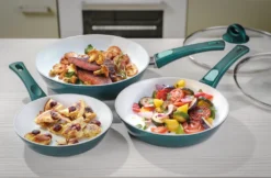- Ergonomisch geformte, rutschhemmende Griffe mit Silikon-Beschichtung liegen sicher und angenehm in der Hand für komfortables Kochen.