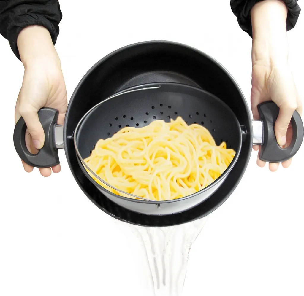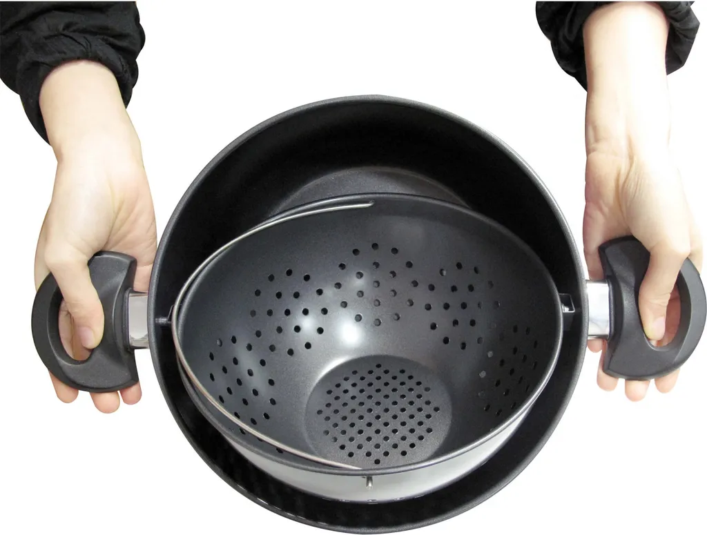 Der World’s Greatest Pot ist ein Kochtopf mit integriertem Sieb. Mit diesem Topf können Sie ganz bequem Nudeln kochen, Wasser abgießen, Speisen dampfgaren und vieles mehr – alles in einem praktischen Kochtopf mit Antihaft-Beschichtung. Perfekt für Nudeln, Kartoffeln, Mais, Eier, Gemüse uvm. Einfach Pasta kochen, wenn diese gar sind, den Topf an den Griffen festhalten, auf den Kopf drehen und das Kochwasser abfließen lassen. Dank des integrierten Siebs können Sie auch problemlos Gemüse dämpfen ohne Vitaminverlust – für eine bewusste und gesündere Ernährung.
