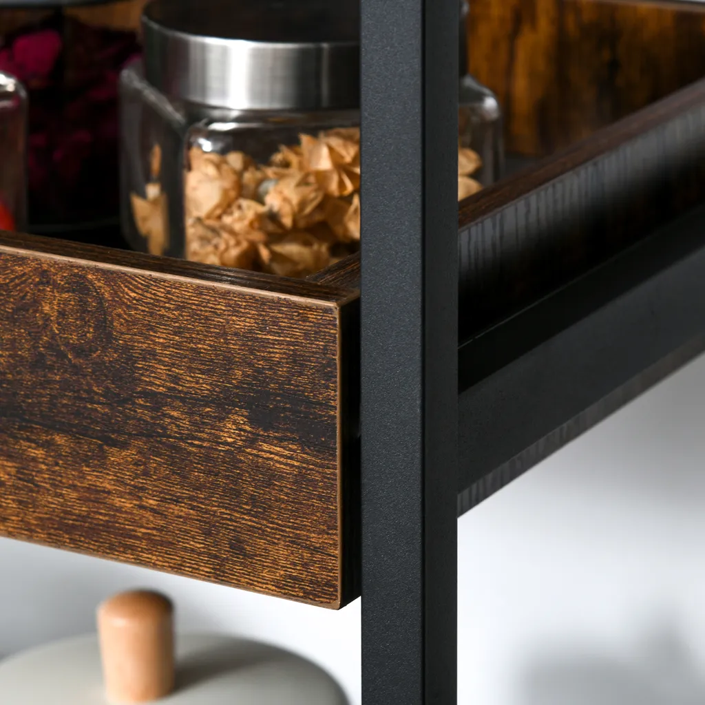 Aus ausgewählten Materialien gefertigt, kann dieser Küchenwagen bis zu 20 kg tragen. Der Metallrahmen ist rostfrei und die Oberfläche aus Holzmaserungsfurnier ist leicht zu reinigen.