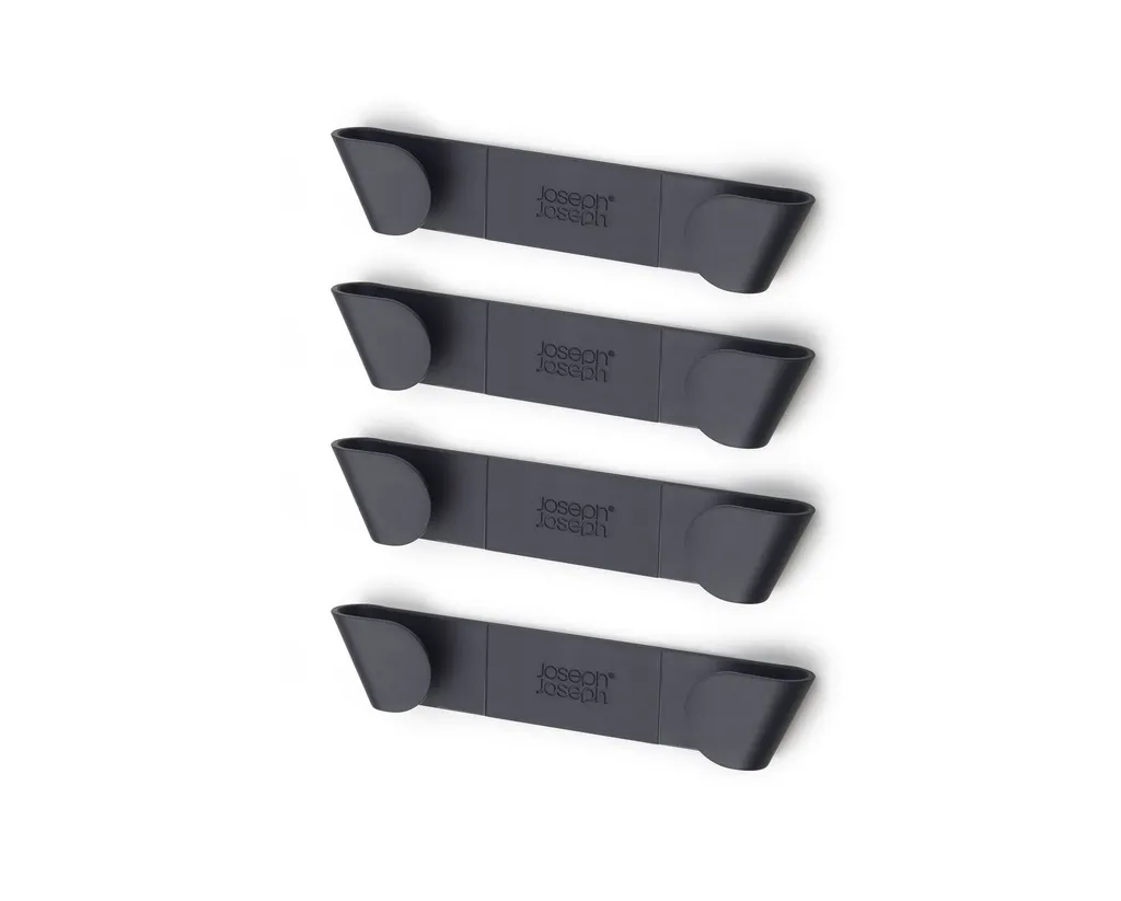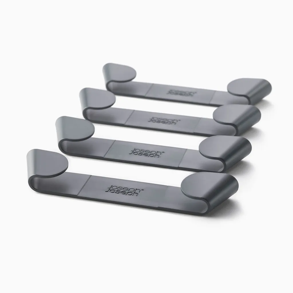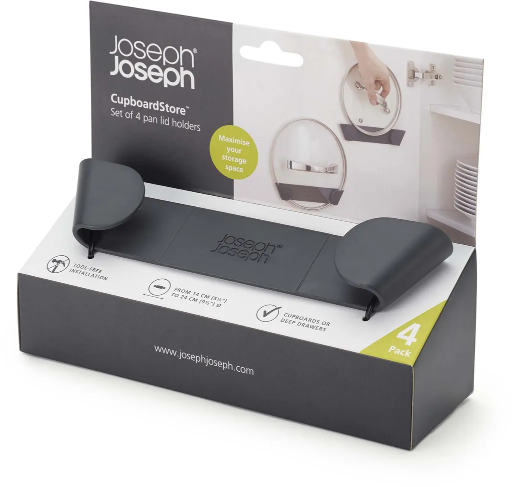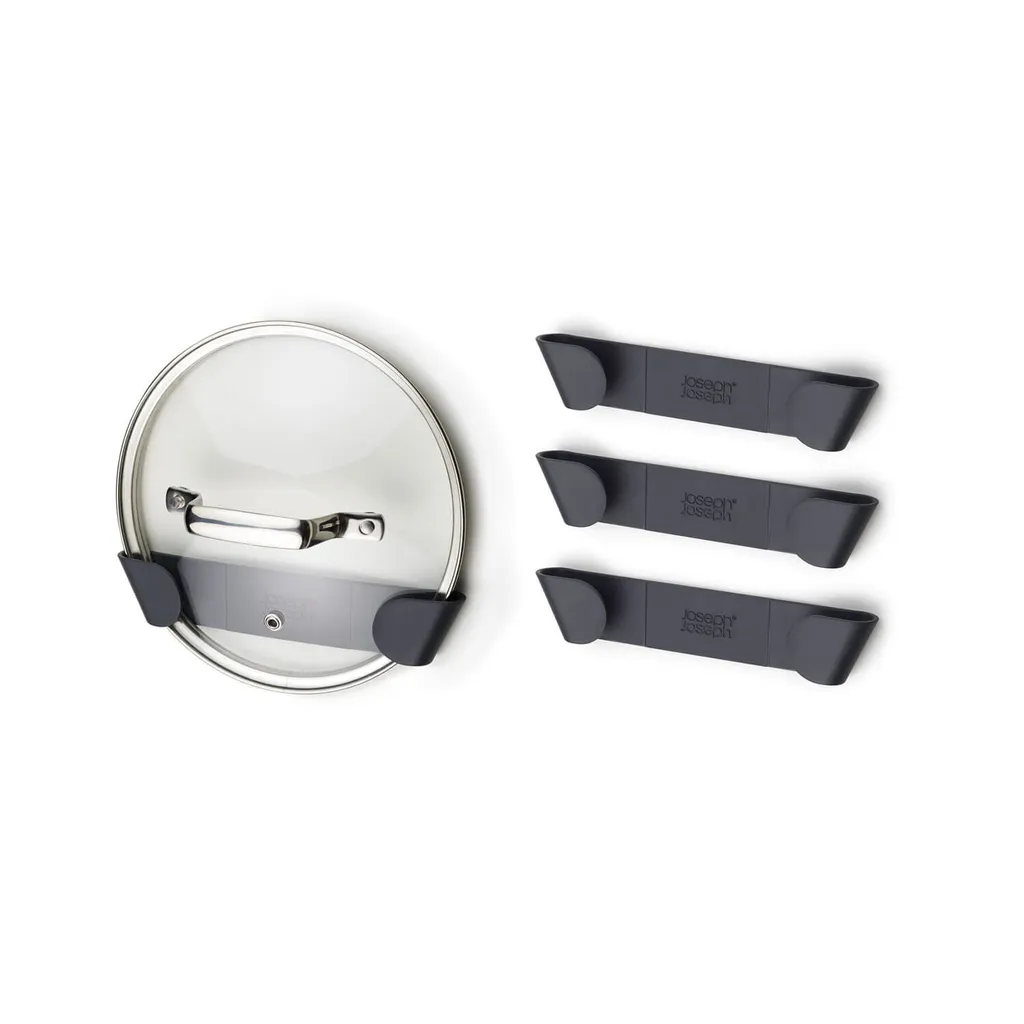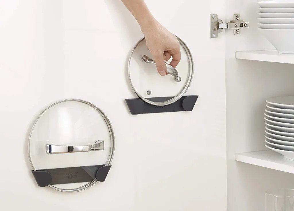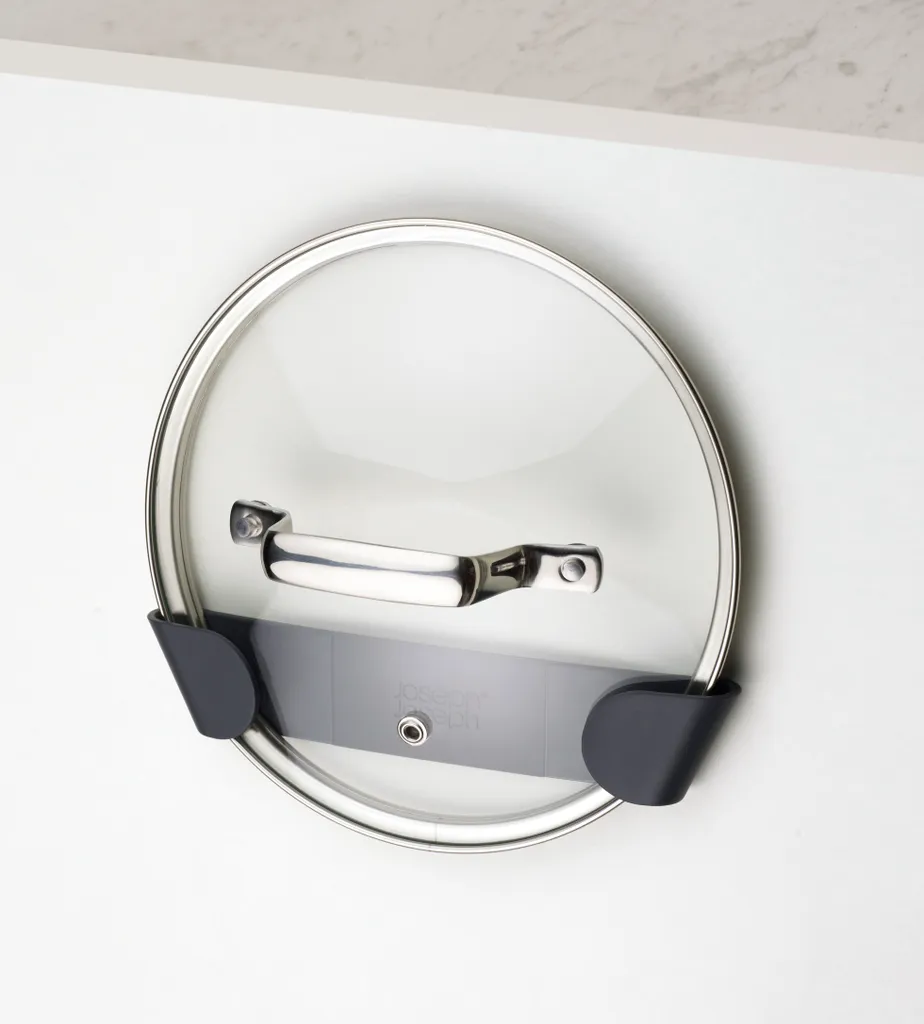 Kochtopfdeckel sind eine nervige Angelegenheit – insbesondere die Aufbewahrung. Auf den Töpfen verhindert das Ineinander Stapeln von Töpfen, daneben nehmen sie Platz weg für weitere Töpfe. Die Topfdeckelhalter CupboardStore von Joseph Joseph sind die ideale Lösung. Sie werden einfach mit Klebaband auf der Innenseite von Schränken oder Schubladen montiert und schon finden Deckel von 16 – 24 cm ihren neuen Platz.