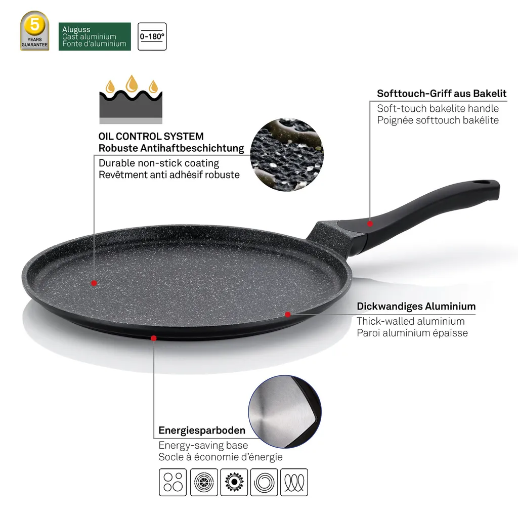 Die Antihaftbeschichtung, der große Durchmesser und der niedrige Rand sorgen für hervorragende Ergebnisse beim Braten von Pfannkuchen, Omelettes, Crumpets usw.