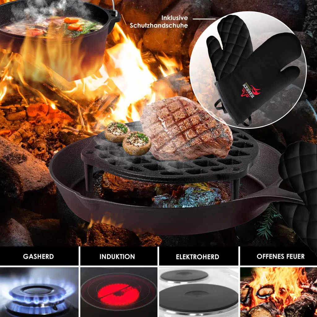 Mit dem Dutch Oven Set von KESSER sind Sie optimal für Ihr nächstes Outdoor Erlebnis ausgerüstet, denn mit dem hochwertigem Set aus Gusseisen können Sie auch bei offener Flamme köstliche Speisen zubereiten. Aber auch im Innenbereich können Sie leckere Köstlichkeiten auf Ihrem Herd zaubern. Ganz egal ob ein Gasherd, Induktionsherd oder Elektroherd – Ihre Speisen werden Ihnen und Ihren Gästen bestens schmecken.