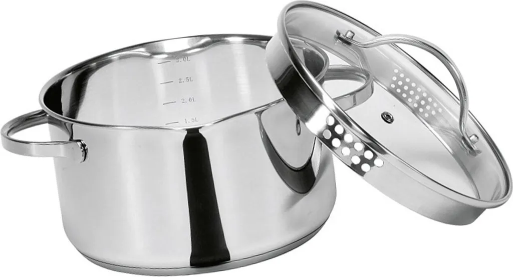 Edelstahl rostfrei, mit Kapselboden, innen und außen hochglanzpoliert, innen mit Literskala, gebördelter Rand mit zwei gegenüberliegenden Ausgüssen, Glasdeckel mit Dampfloch und verlängerten Abseihöffnungen, für alle Herdarten geeignet, auch für Induktion