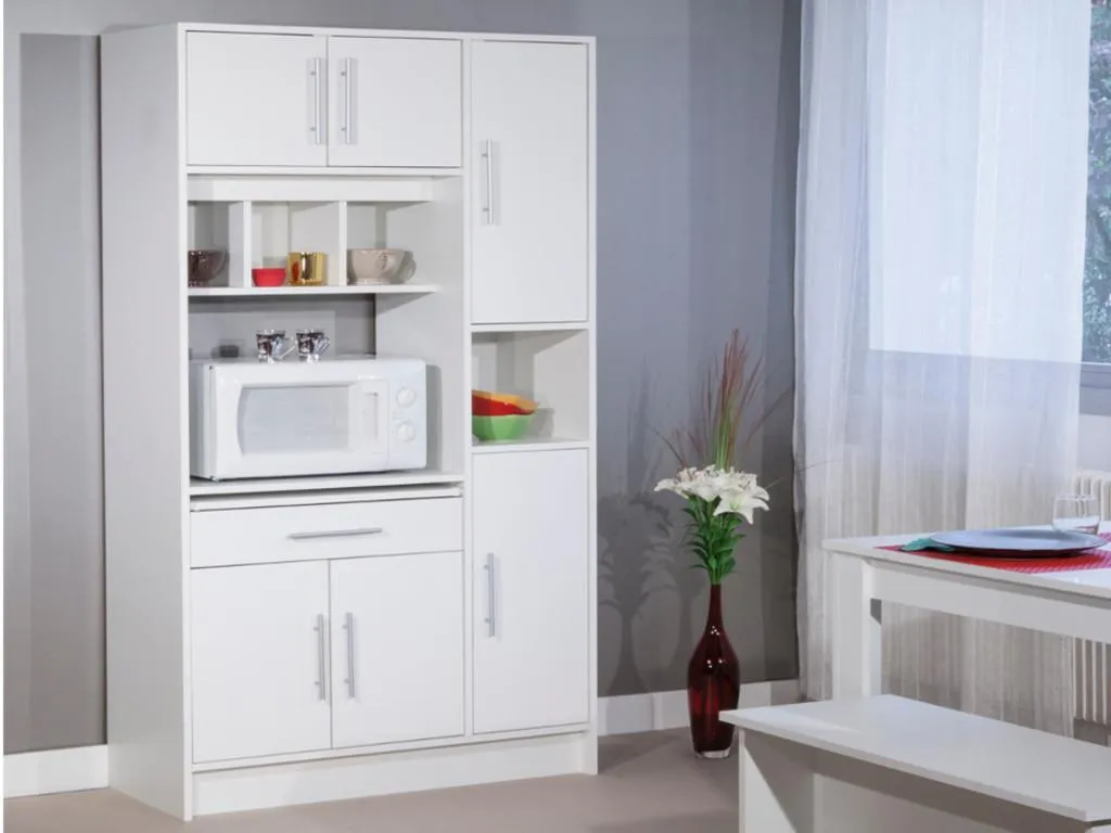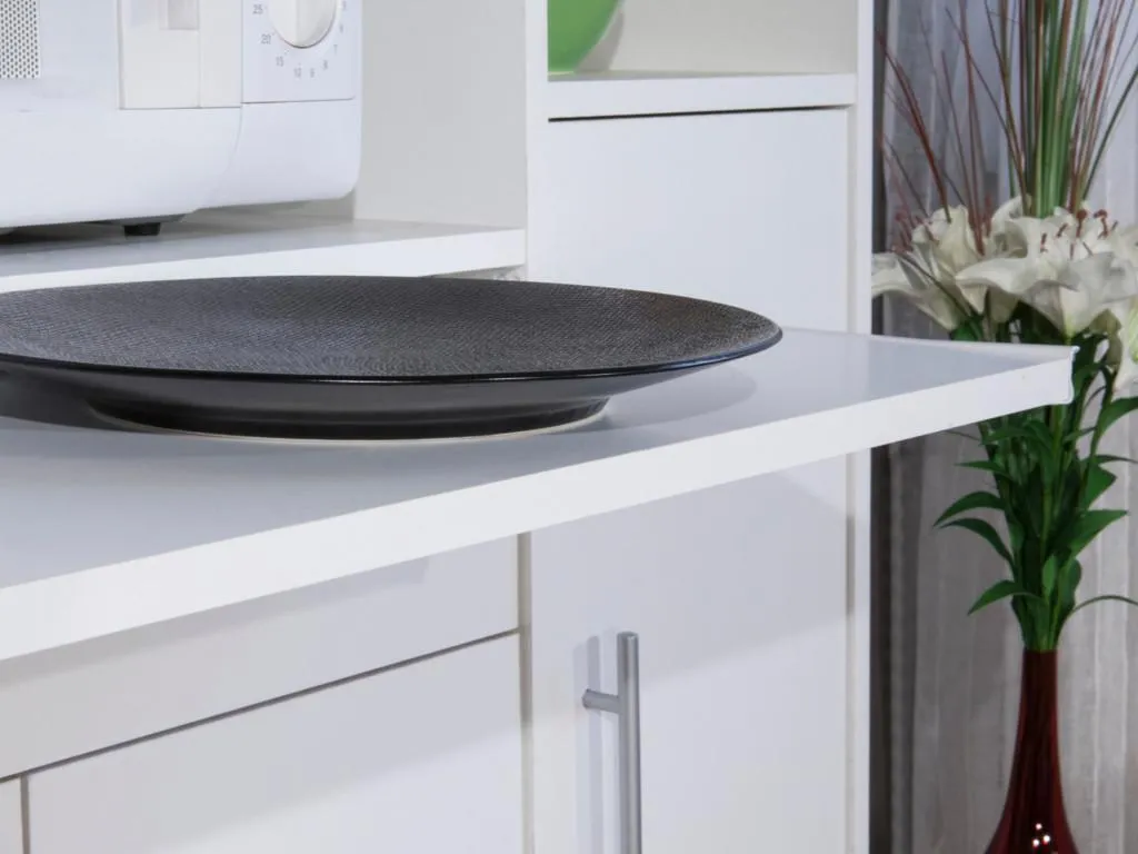 - Aufbau: 5 Türen, 1 Arbeitsplatte zum Herausziehen, 4 Ablageflächen, 1 Schublade, 1 Fach für die Mikrowelle