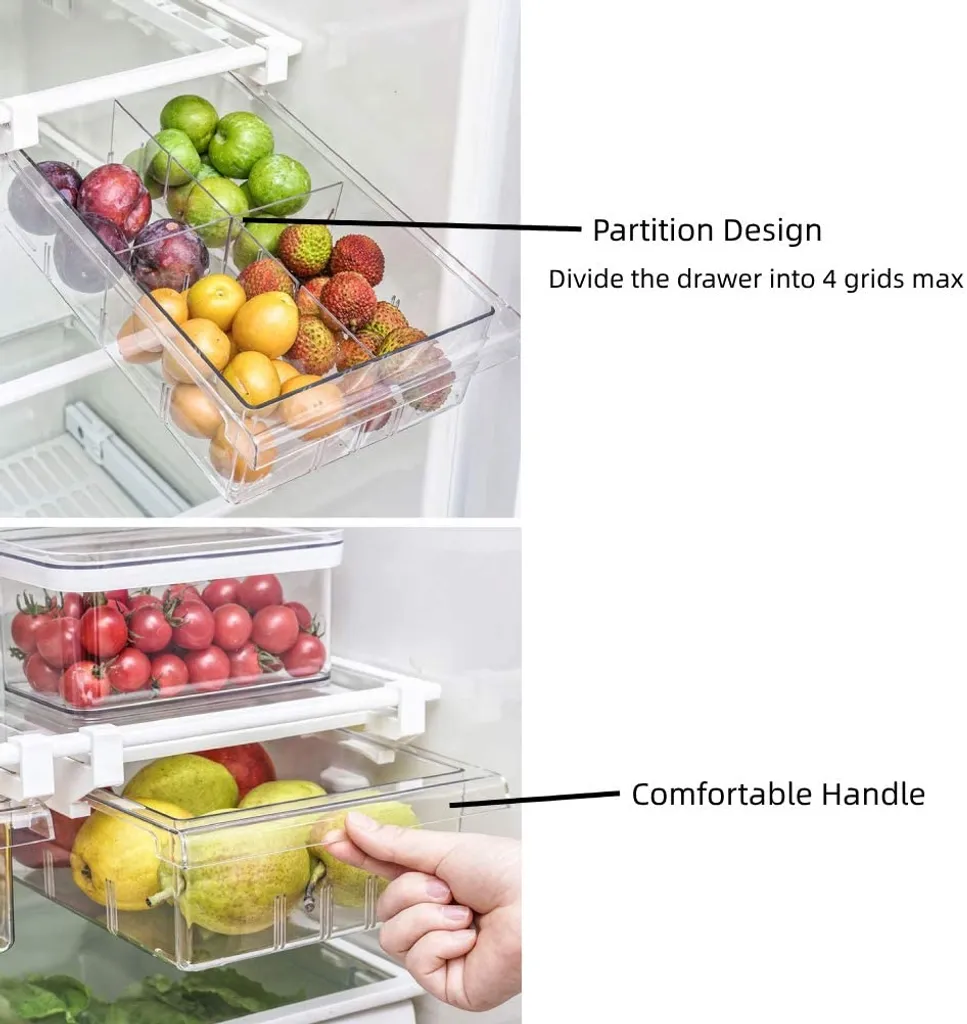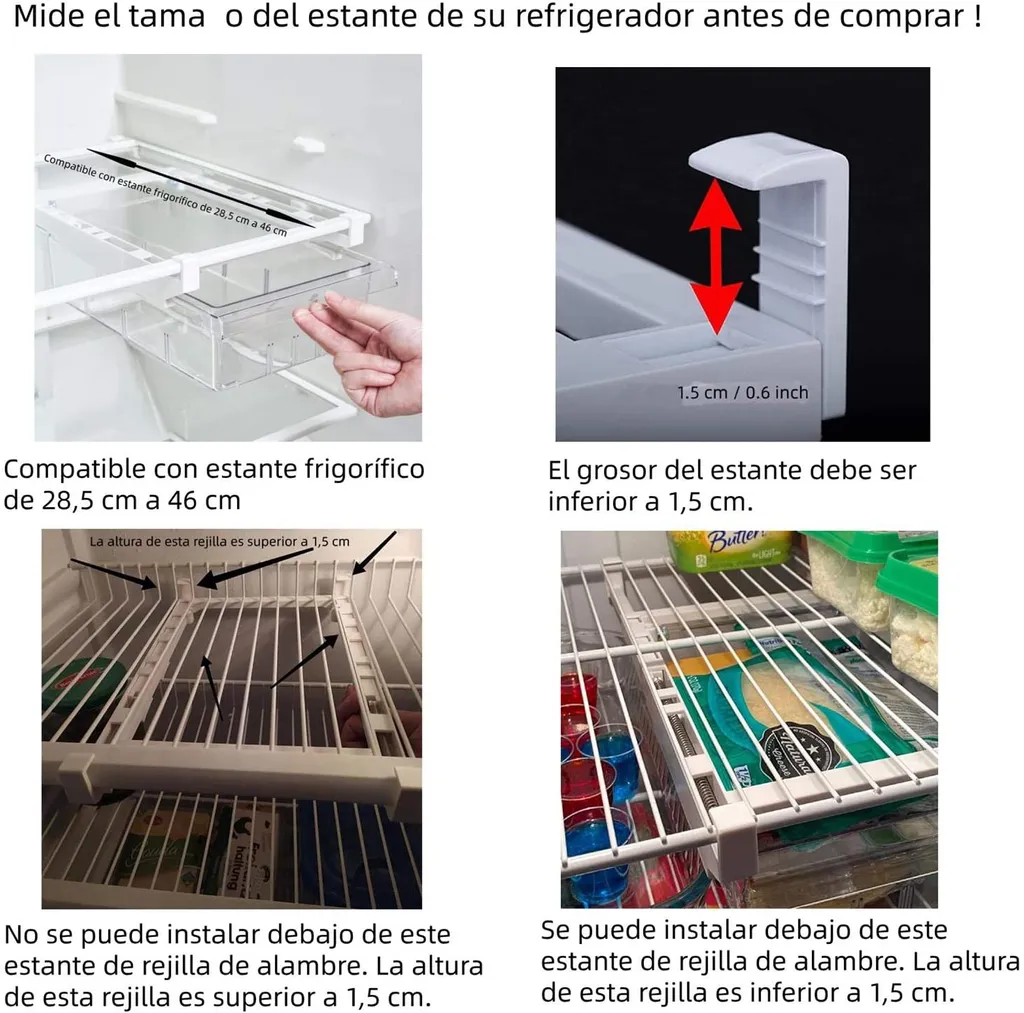 Einfach zu bedienen: Schieben Sie es einfach auf das Kühlschrankregal, um die Schubladen zu installieren. Mit den Universalclips können sie wie normale Schubladen gezogen und in jedem Regal beliebiger Dicke verwendet werden.