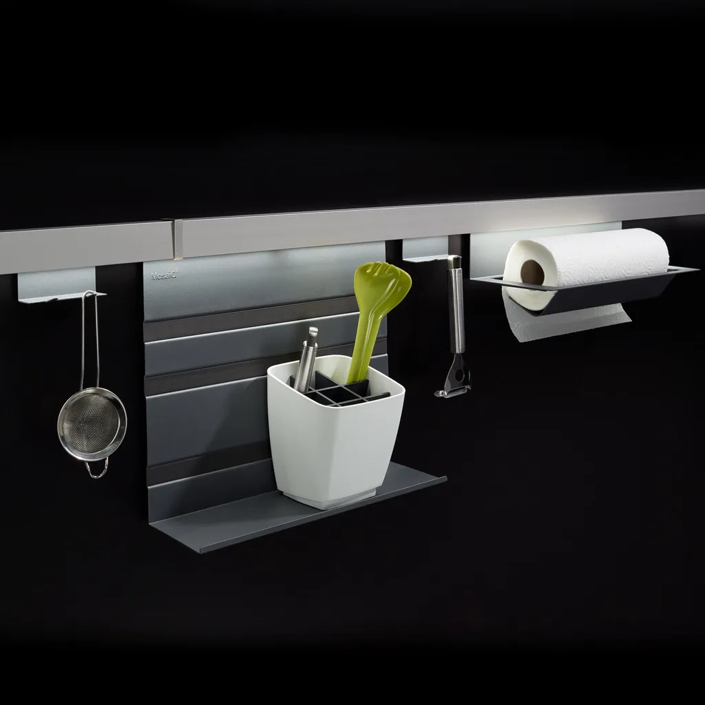 LINERO MosaiQ funktioniert nach einem Baukastensystem und bietet Ihnen unzählige Gestaltungs- und Anwendungsalternativen. Dazu zählen Universalablagen z.B. für die Platzierung eines Kochbuches oder iPads, Köcher für Kochutensilien, Hakenleiste, Tuch- oder Kellenhalter, Doppelrollenhalter mit patentiertem Abrisssystem, Papierrollenhalter, Memoboard und Messerhalter mit Magnet.