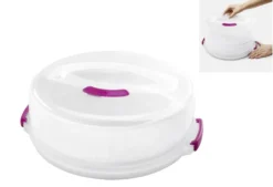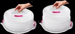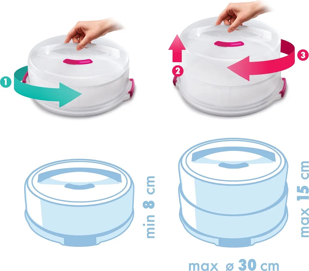 Dieser Tortenbehälter passt sich ganz einfach, durch Ausziehen des Deckels, an die Größe des Kuchens an. Mit Tragegriff. Mit seitlichen Verschlüssen.