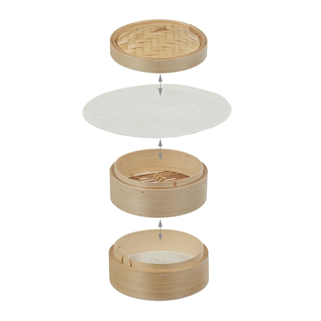 Mit dem klassischen Bambusdämpfer bereiten Sie auf traditionelle Weise Reis für asiatische Gerichte zu. Das Dämpf-Set aus geflochtenem Bambus besteht aus 2 Dampfkörben und einem Deckel. Stellen Sie den Dämpfer in einen Wok oder auf einen Topf mit kochendem Wasser. Der Dampf zieht durch die Schlitze im Boden und gart jede Sorte Reis auf schonende Weise. Nutzen Sie die Behälter auch zum Zubereiten von Gemüse oder Fisch. Mit dem Bambus Steamer zaubern Sie gesunde, leckere Gerichte auf den Teller.