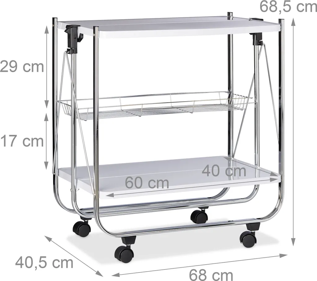 Der klappbare Servierwagen besticht durch Funktionalität und ein modernes Design. Mit diesem Küchenhelfer können Sie Geschirr, Flaschen, ganze Mahlzeiten oder Tisch-Gedecke bequem transportieren. Auch als mobiler Beistelltisch ist der Rollwagen ideal geeignet. Seine 4 Räder rollen dabei leise und sind komplett drehbar. Damit funktioniert die Lenkung problemlos auch auf kleinem Raum.