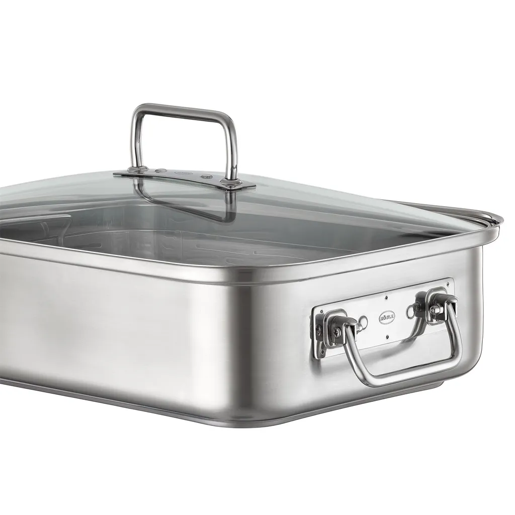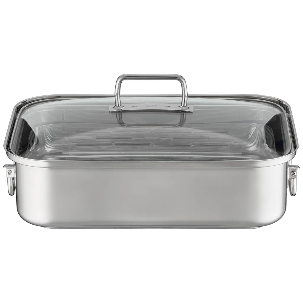 Die Griffe sind klappbar, was die Verwendung des Bräters nicht nur auf dem Herd, sondern in Backöfen möglich macht – der Deckel ist aus gehärtetem, bruchsicherem Glas gefertigt.
