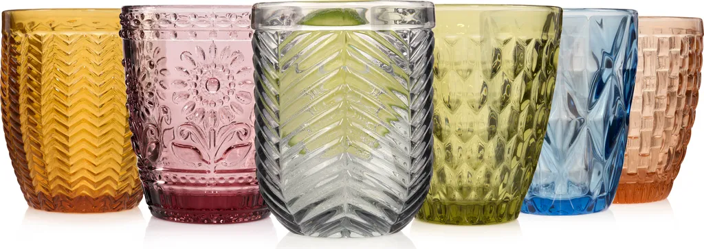 Moderne, bunte Trinkgläser, die aus einer anderen Zeit zu sein scheinen, in sechs, sorgfältig aufeinander abgestimmten Farben: Grün, Bernstein, Blau, Grau, Braun, und Lila werden Ihren gedeckten Tisch perfekt ergänzen. Dieses spülmaschinenfeste Wassergläser Set sieht nicht nur toll aus, es ist äußerst funktional, langlebig und robust