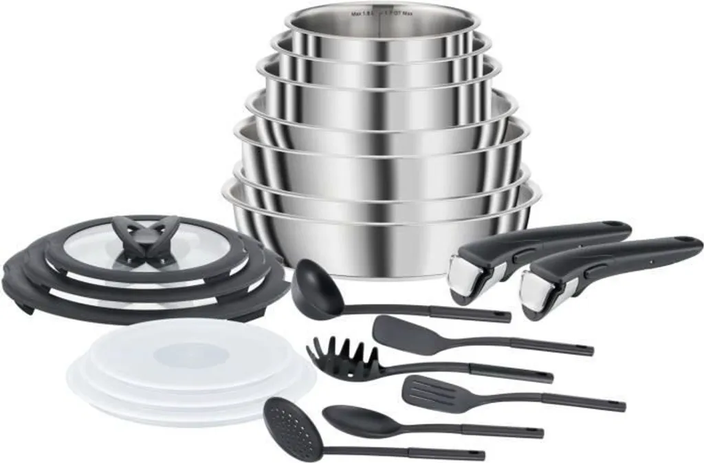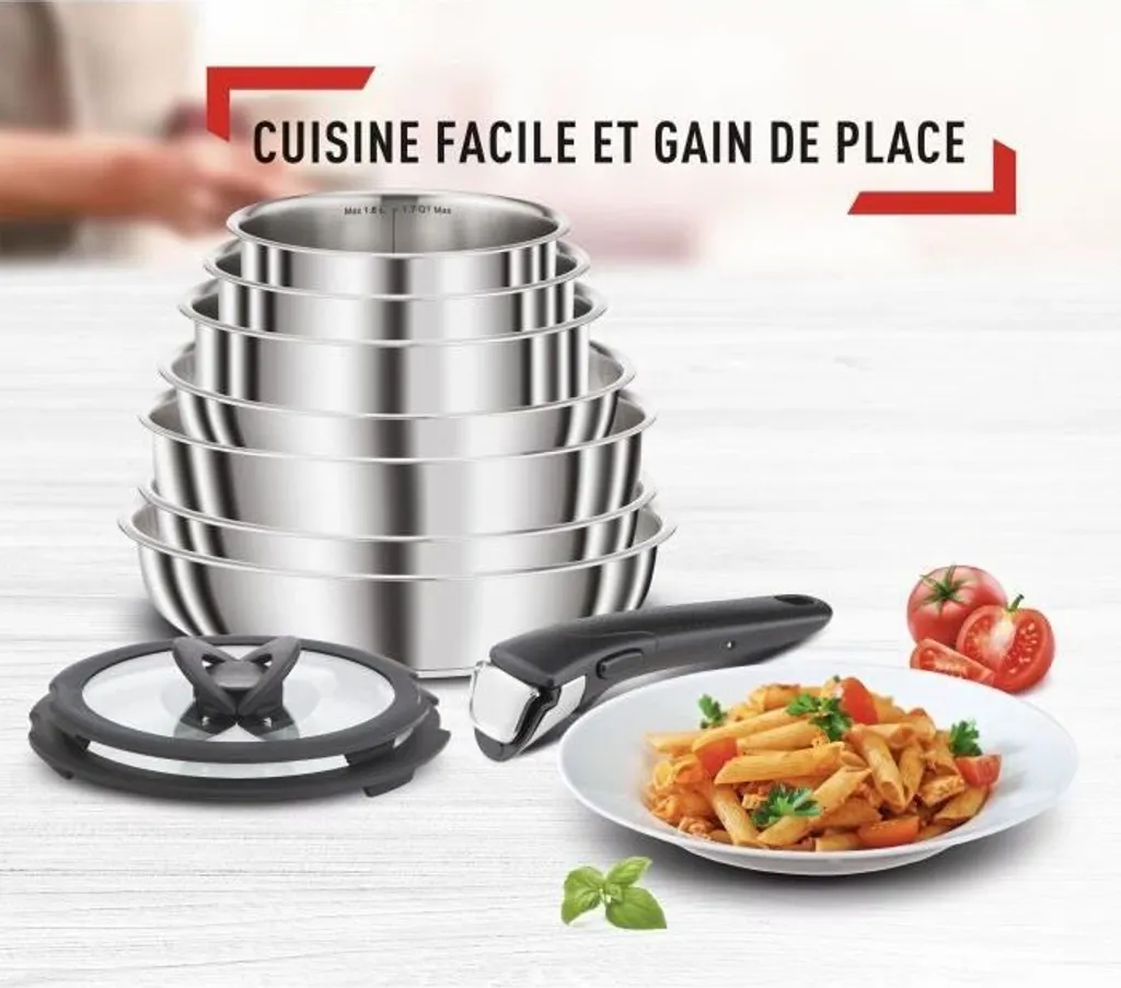 Seb Compact kombiniert optimale Kochleistung mit maximalem Komfort und bietet die perfekte Auswahl für den einfachen täglichen Gebrauch. Dieses stapelbare Kochgeschirr ist mit allen Kochfeldern einschließlich Induktion kompatibel und aus hochwertigem Edelstahl gefertigt. Ultrakompakt mit einem abnehmbaren Ein-Klick-Griff, der sich leicht verstauen lässt. Vom Herd zum Ofen, vom Tisch zum Kühlschrank, S.
