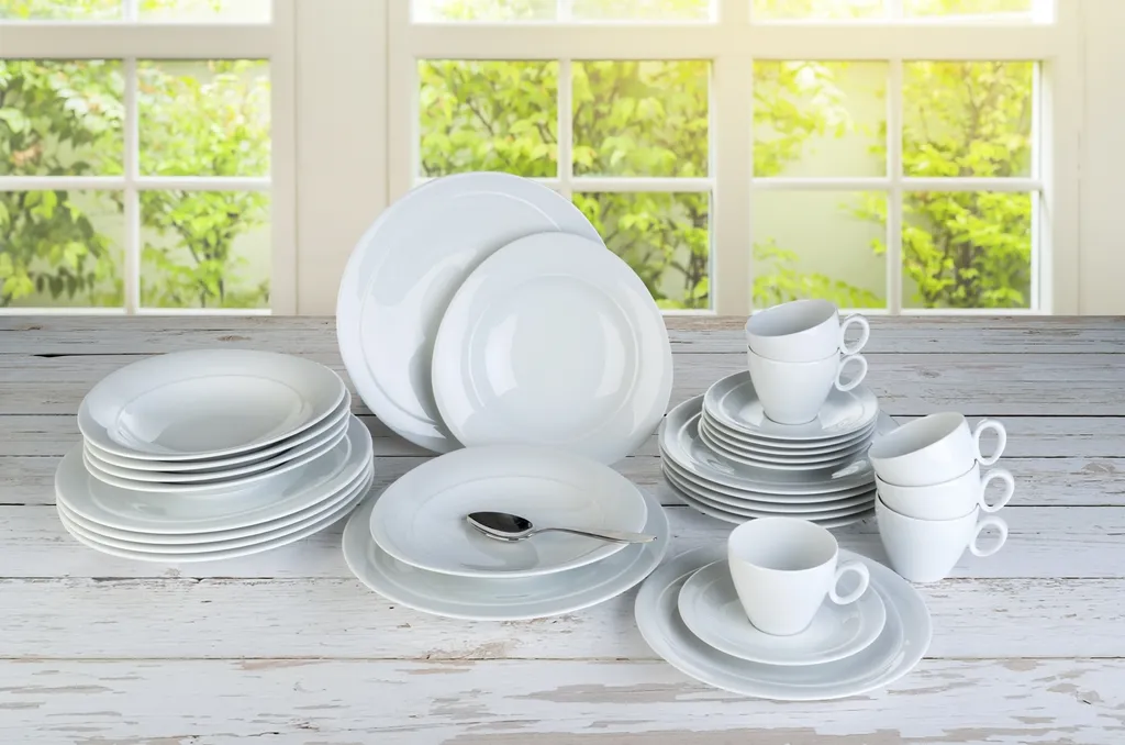 30-teiliges Kombiservice: 6 Speiseteller, 6 Suppenteller, 6 Dessertteller, 6 Untertassen und 6 Kaffeetassen