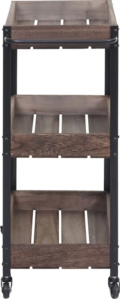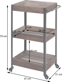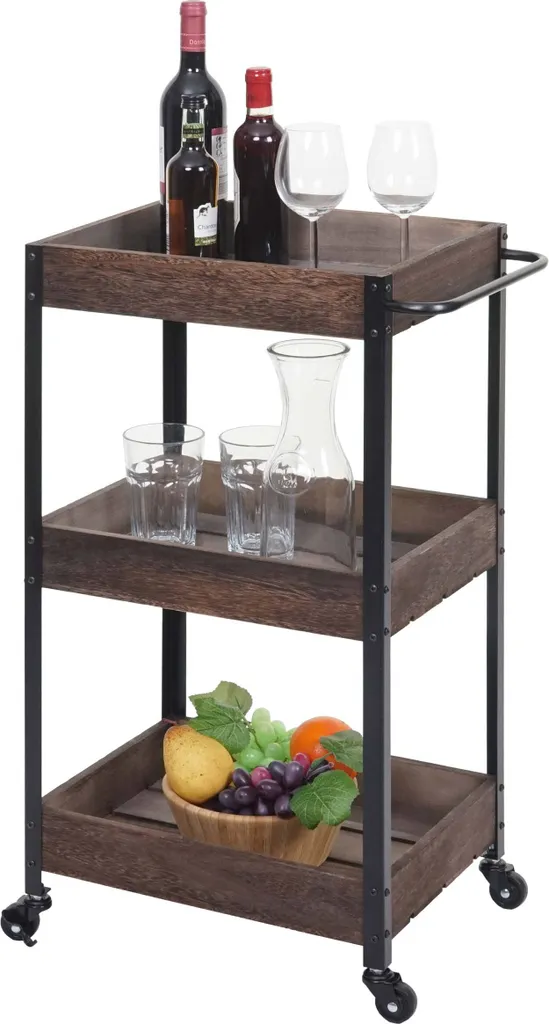 Dürfen wir vorstellen: Ihr neuer Allzweck-Küchenhelfer. Egal ob Sie ihn als zusätzlichem Lagerplatz für Ihre Lebensmittel, als Beistelltisch oder als Servierwagen verwenden wollen – alles kein Problem. Dank der vier Rollen kann er jederzeit bequem bewegt werden und ist an zwei Rollen auch arretierbar. Dadurch kann dieser Küchenwagen sicher abgestellt werden. Die Arbeitsfläche bietet sogar ausreichend Platz ein Essen zuzubereiten. Der Wagen aus Holz ist sowohl robust als auch stabil. Die drei Ablagekörbe können sowohl als Flaschenablage oder aber auch als Ablage für Kochbücher oder sonstige Küchenutensilien genutzt werden. Der individuelle Look wirkt einerseits rustikal, anderseits schafft es Akzente in Ihren heimischen vier Wänden.