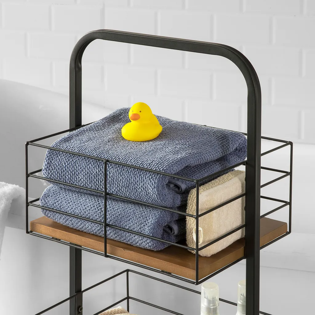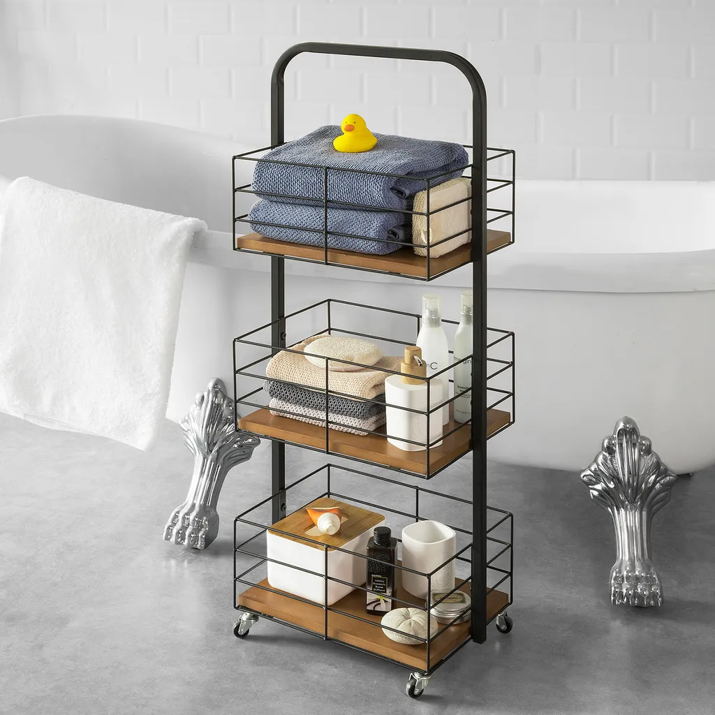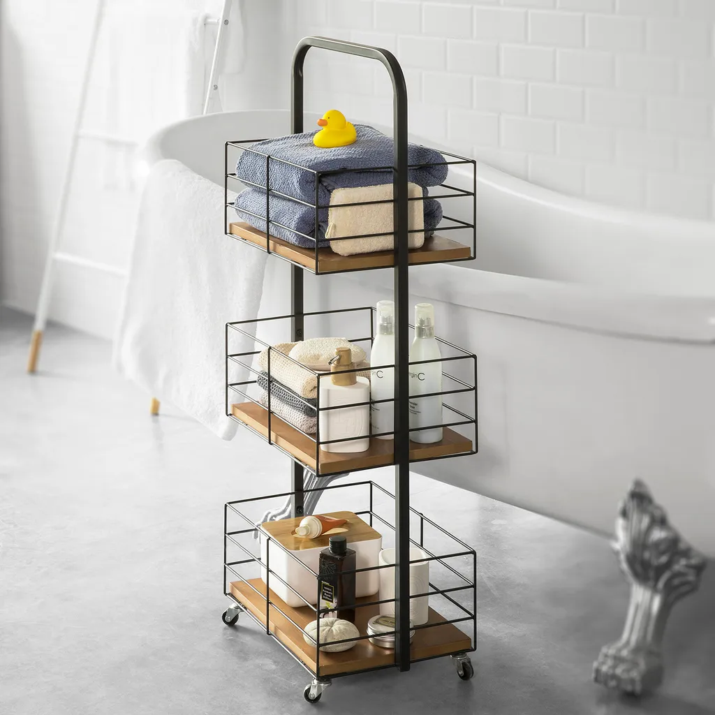 Dieser Regalwagen mit gleich drei Körben trägt alles von Nahrungsmitteln bis hin zu Wäscheutensilien oder Badzubehör und Kosmetikartikel.
