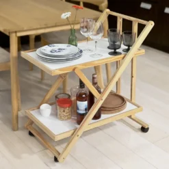 Falls der Servierwagen einmal nicht benötigt wird, lässt sich der Servierwagen mit dem Handgriff zusammenklappen und platzsparend verstauen.