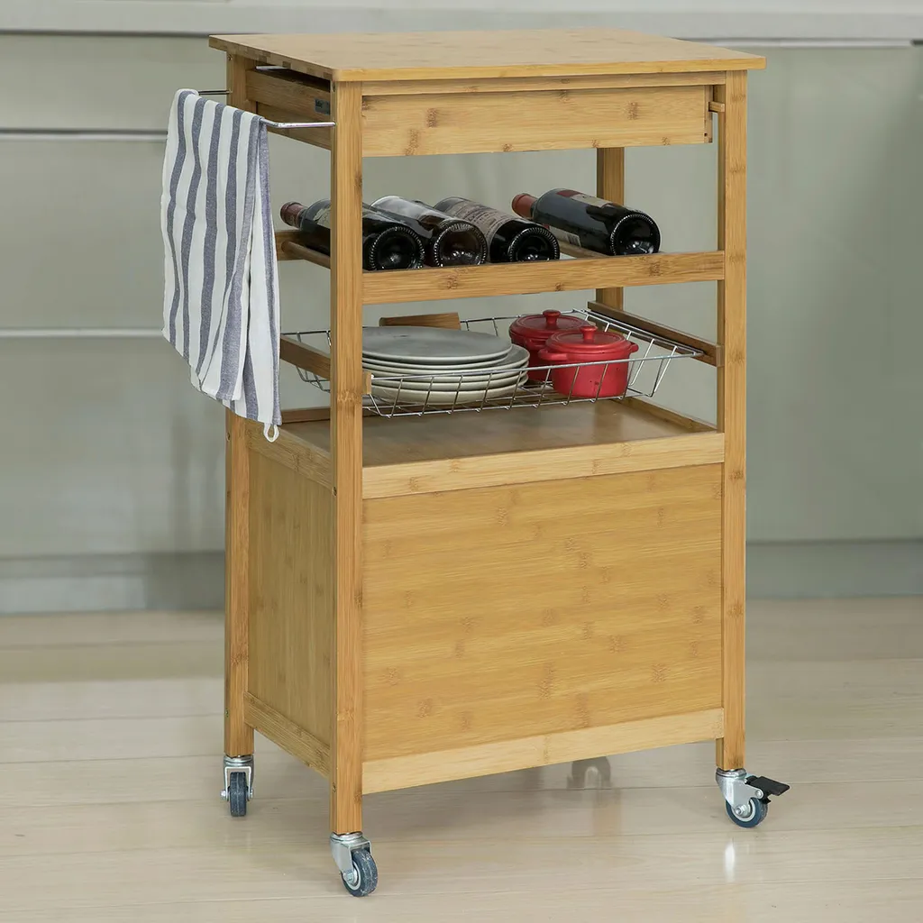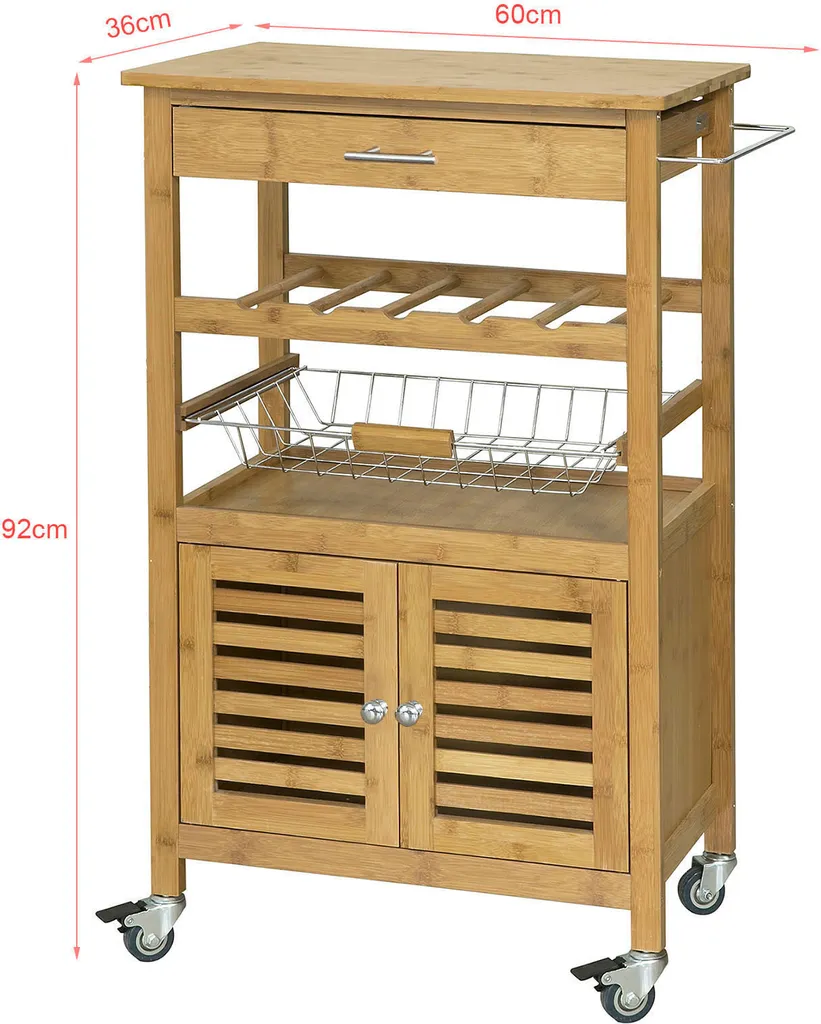 Ausgestattet ist dieser praktische Küchenwagen mit einer Schublade, zwei Türen, einem Handtuchhalter, einer Flaschenablage und einem herausnehmbaren Gitterkorb.