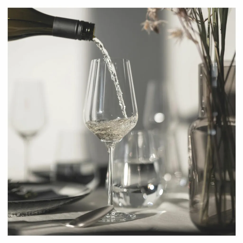 Pure Formsprache ‐ präzise im Detail: Das Weißweinglas‐Set ist mit einer innenliegenden Reliefstruktur aufwendig gearbeitet und lässt ein Wechselspiel von Licht und Schatten entstehen.