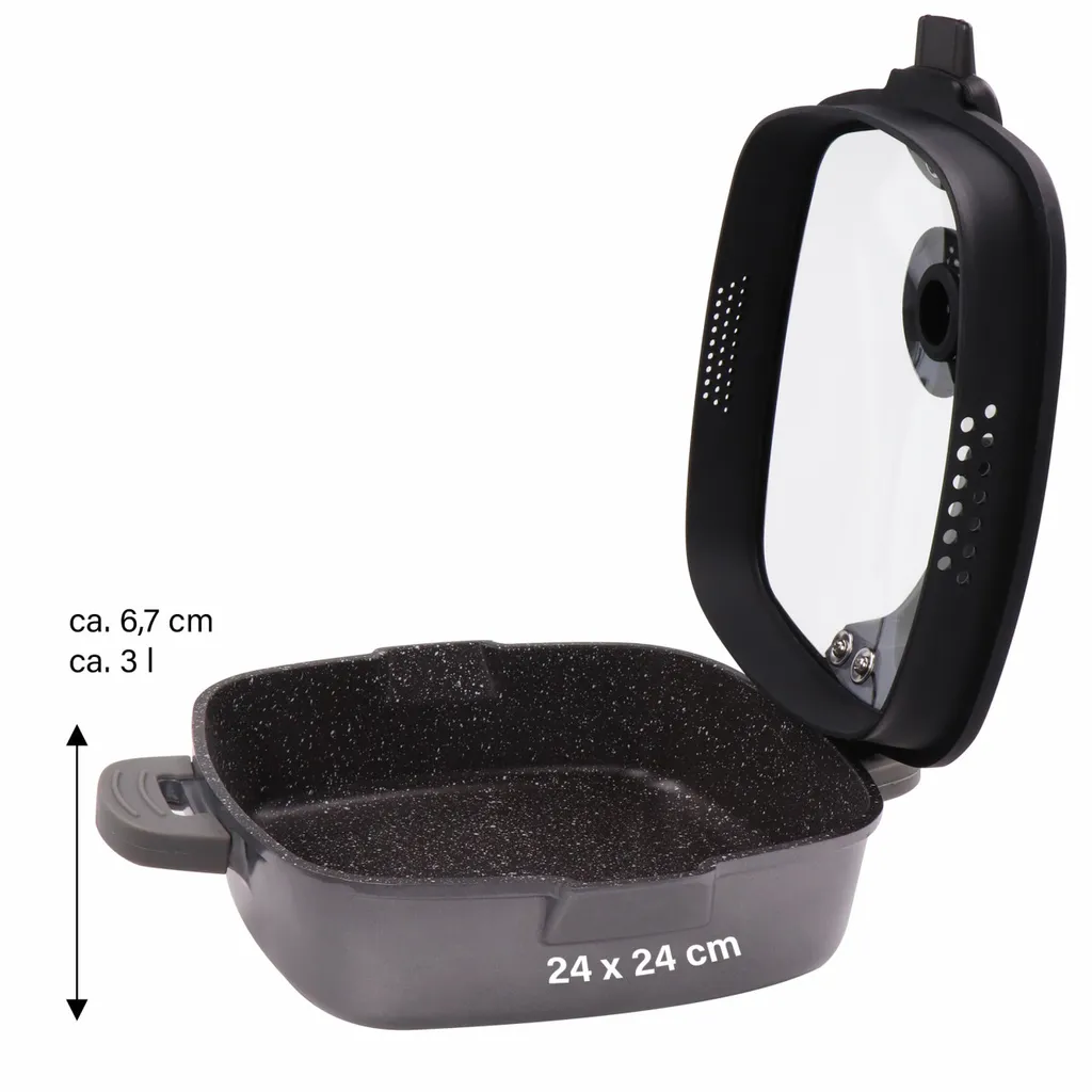 Im Set enthalten ist neben dem Smell Well Glasdeckel mit Siebfunktion außerdem die STONELINE® FUTURE Eckpfanne mit 24 x 24 cm. Die Eckpfanne hat mit 6,7 cm einen extra hohen Rand und ein Fassungsvermögen von ca. 3,0 Liter und eignet sich dadurch hervorragend für alle Brat- und Schmorgerichte!
