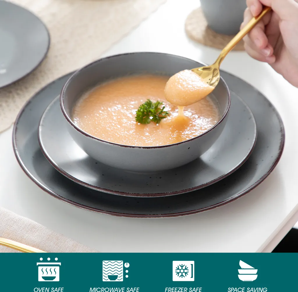 - Außerordentliches Design und einzigartiges Aussehen. Aus hochwertigem und umweltfreundlichem Steingut ist unser Kombiservice von Hand gefertigt. Naturfarbene seidenmatte volle Sprenkelglasuren, erlesene braune Augenwimper kante, außergewöhnliche handbemalte Verarbeitung und elegantes Vintage Aussehen.