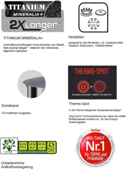 QUALITÄT: Pflegeleichtes, robustes Rostfrei-Edelstahl. Beschichtet mit der neuen 6-Lagen TEFAL TITANIUM MINERALIA+ Antihaftbeschichtung für Kochutensilien aus Metall, hält zweimal länger* – ideal für den intensiven, täglichen Gebrauch . Frei von giftigen Chemikalien (Blei, Cadmium und Emaille, ohne und Ptfe frei). Pfannenböden für Induktionsherd, Elektroherd, Ceranfeld und Glaskeramik sauber entgratet