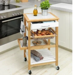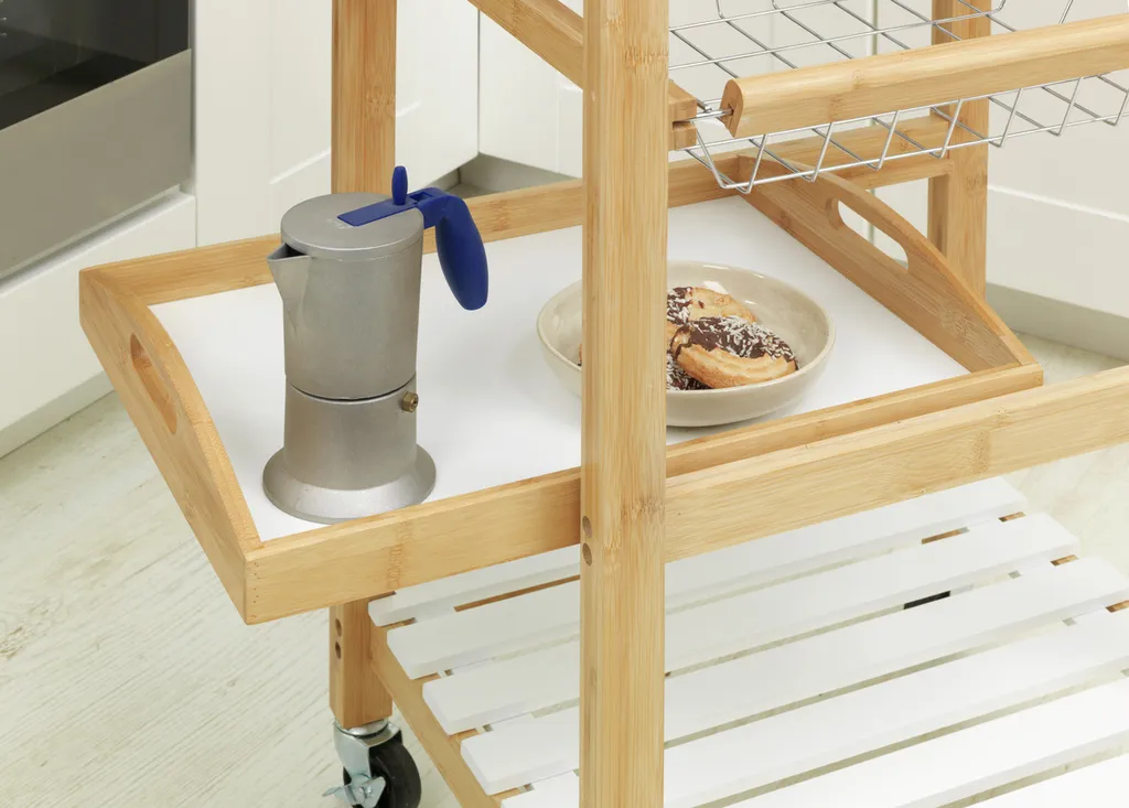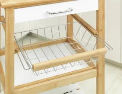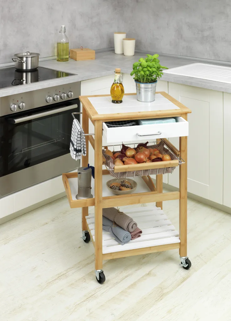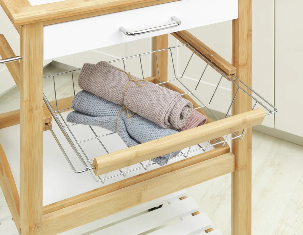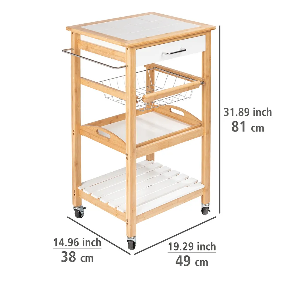 Bambus ist ein Naturmaterial, das sehr schnell nachwächst und sehr beliebt ist. Dieser universelle Rollwagen überzeugt durch seine vielseitigen Einsatzmöglichkeiten und seine Gestaltung in weißen MDF-Platten. Dies ist durch seine große Ablagefläche, einer Schublade, einem herausnehmbaren Drahtkorb und einem abnehmbaren Tablett sichergestellt. Dieser Rollwagen ist praktisch und sehr vielseitig, um Speisen und Getränke bequem an einen gewünschten Platz zu bringen. Ob in Ihrer Küche, im Ess- oder Wohnzimmer oder auf der Terrasse und Balkon. Auf ihm können Sie leicht und einfach Speisen und Getränke anbieten: Frühstück , Buffets für die Party am Abend und zum Grillfest. Oder Sie platzieren den Servierwagen fest an einem Ort.