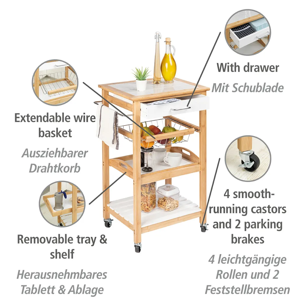 Lieferumfang: Küchenwagen Finja von WENKO aus nachhaltigem Bambus/MDF, Maße (B x H x T): 49 x 81 x 38 cm, Schublade (B x H x T): 37 x 6 x 32,5 cm, einfache Montage von Wagen und Rollen mit beiliegenden Schrauben