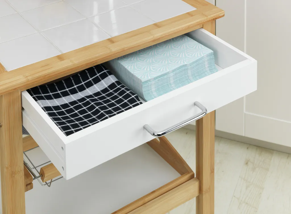 Großzügiger Stauraum: Der schicke Servierwagen bietet mit einer Ablagefläche, einer Schublade, einem herausnehmbaren Drahtkorb und einem herausnehmbaren Tablett großzügige & dekorative Abstell- und Transportmöglichkeiten für Küche, Esszimmer, Wohnzimmer oder Terrasse und Balkon. Die obere Ablage ist mit neun Keramikfliesen ausgestattet. Der Handtuchhalter kann auch als Griff zum bequem Schieben & Ziehen benutzt werden, das macht das Reinigen des Bodens kinderleicht