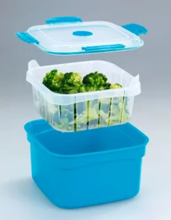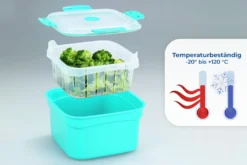 Die zubereiteten Speisen können in dem Mikrowellen-Dampfgarer aufbewahrt, eingefroren und transportiert werden. Der Maximex Mikrowellen-Dampfgarer mit 2 Liter Fassungsvermögen ist zudem spülmaschinengeeignet, lebensmittelecht und temperaturbeständig von -20º bis +120 ºC.