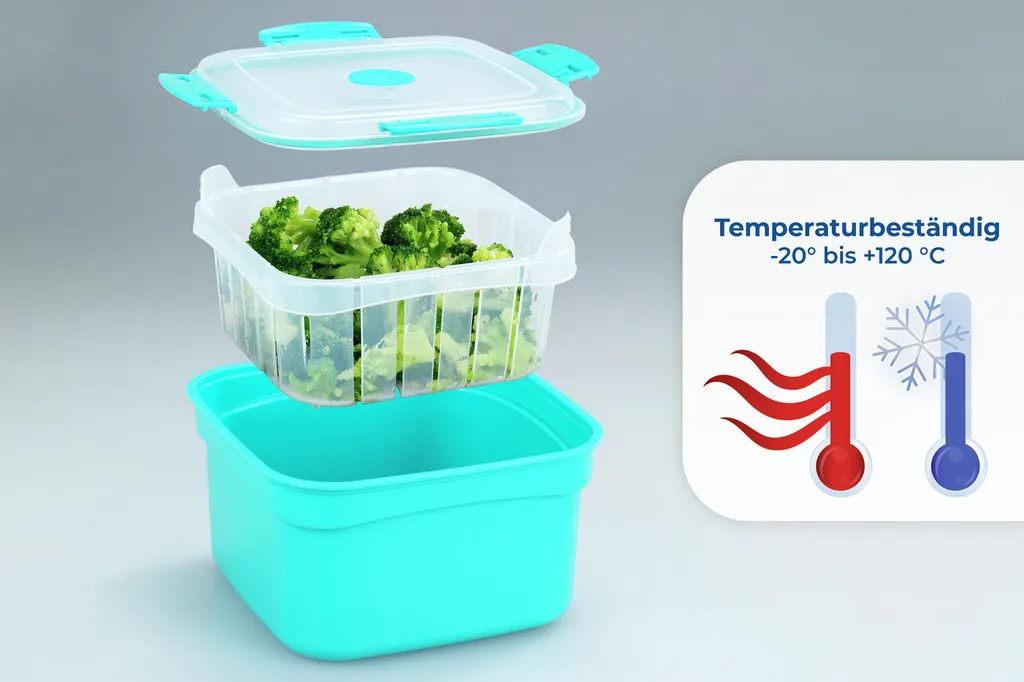 bei extremen Temperaturen – von -20 Grad bis 120 Grad Celsius. - Abmessungen. Der Behälter mit dem Deckel hat Abmessungen von 18,5 x 12 x