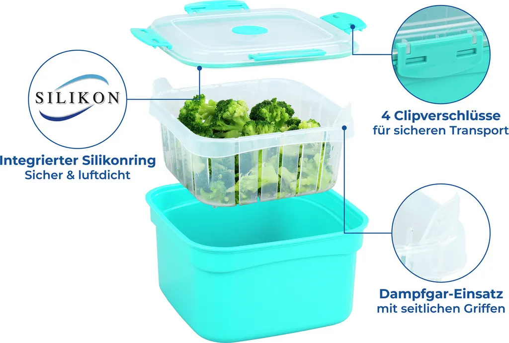 Gefertigt aus lebensmittelechtem Kunststoff (Polypropylen) und einem hochwertigen Silikon-Dichtungsring ist dieser praktische Helfer wirklich vielseitig zu nutzen. Gemüse, Kartoffeln, Fleisch, Fisch & Co. können so kurzerhand in der Mikrowelle zubereitet und anschließend genossen werden. So bleiben Nährstoffe und Aromen erhalten und natürlich schmeckt das Ganze auch viel besser. Sie müssen zu den Zutaten nur noch ein wenig Wasser geben, mit dem Deckel schließen und schon kann es losgehen.