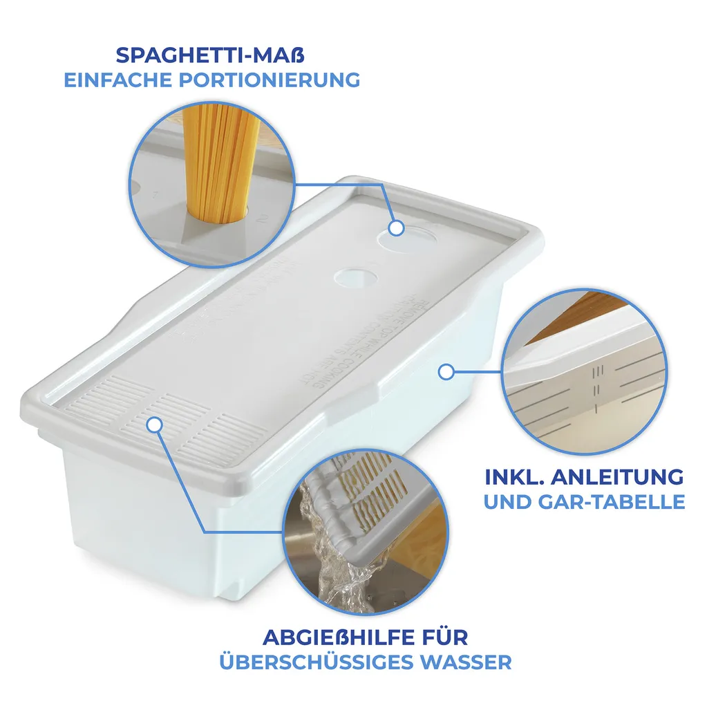 – Mit integriertem Abtropfsieb und Spaghetti-Maß