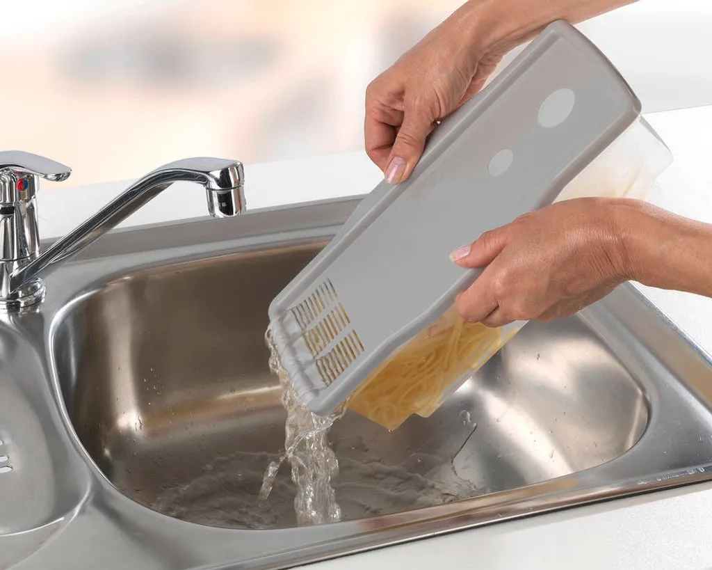 Jetzt müssen Sie nicht mehr warten, bis das Nudelwasser kocht. Füllen Sie einfach direkt Wasser samt Nudeln in den Garer und ab damit in die Mikrowelle. In 6 bis maximal 17 Minuten, je nach Nudelsorte, ist Ihr Essen fertig, ohne dass Sie es Überwachen müssen. Nichts kocht über. Inklusive Anleitung und Gar-Tabelle. Deckel mit integriertem Spaghetti-Maß und Abgießhilfe. Spülmaschinenfest.