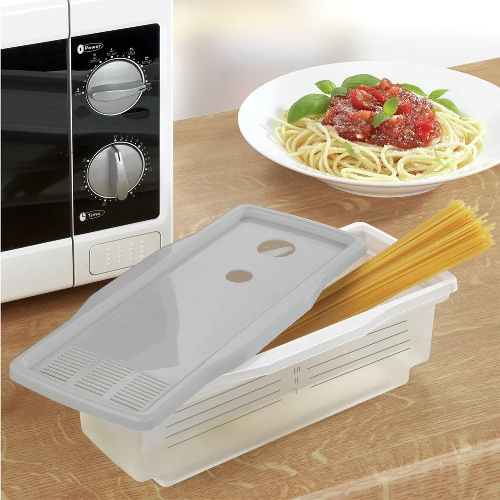 Der Mikrowellen-Nudelkocher von Maximex nimmt Ihnen die Arbeit ab und Sie müssen nie wieder Pasta aufwendig im Topf und auf dem Herd zubereiten. Innerhalb von kurzer Zeit und zudem auch kinderleicht können Sie in Zukunft mit diesem praktischen Helfer Ihre Nudeln kochen. Sie müssen lediglich Wasser und Ihre Lieblingsnudeln in den Pastakocher einfüllen. In der Mikrowelle wird Ihre Pasta direkt zubereitet. Also, kein langes Warten mehr, bis das Wasser auf dem Herd kocht. Der Spaghetti-Kocher verhindert zudem ein überkochen oder Verkleben der Pasta. Sie können jede Art von Nudeln für bis zu vier Portionen zubereiten. So einfach war das Zubereiten von Pasta noch nie.