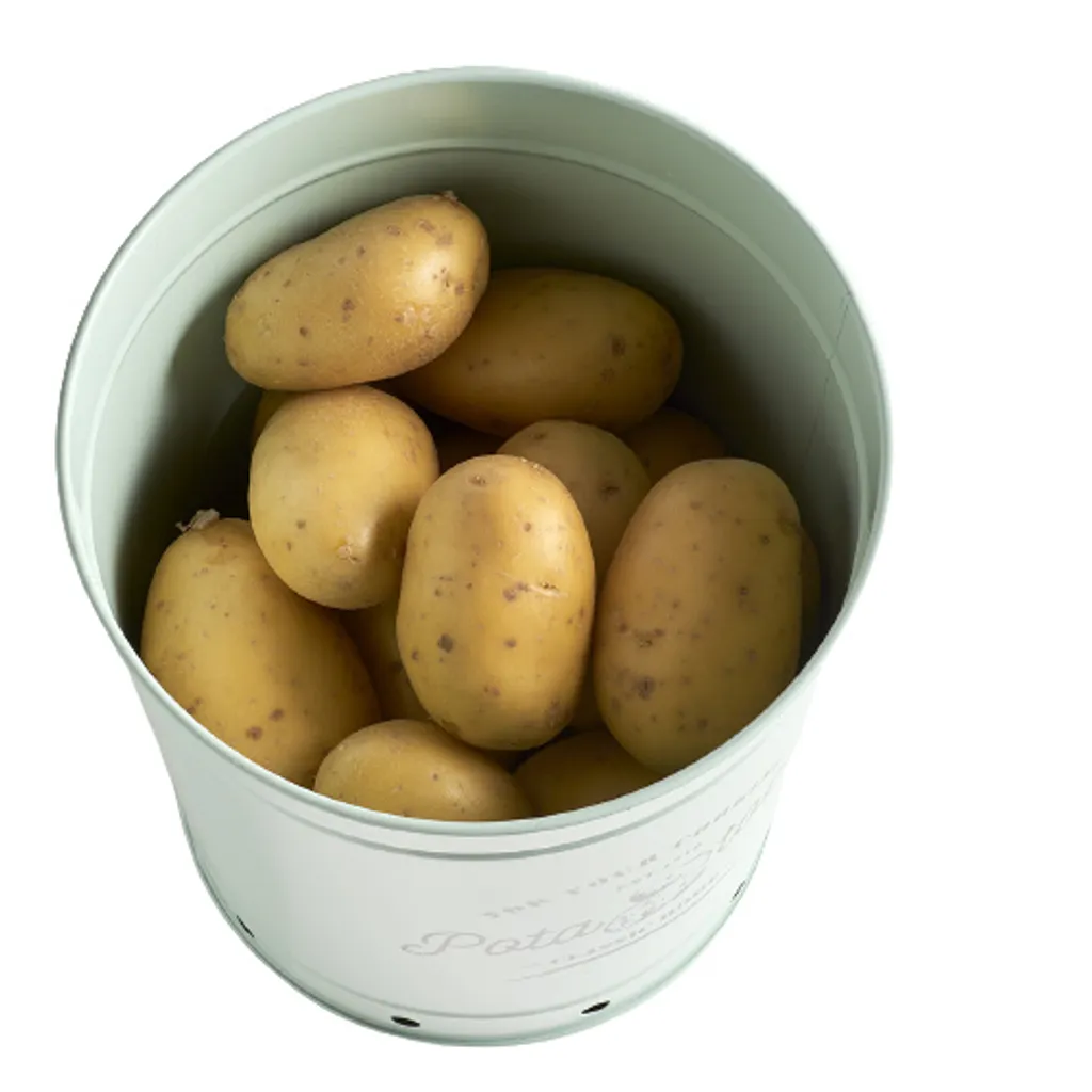 Material: Metall Maße: ca. 19,7 x 21,5 cm Farbe: mint Mit Luftlöchern an der Seite Ideal für die Aufbewahrung von Kartoffeln